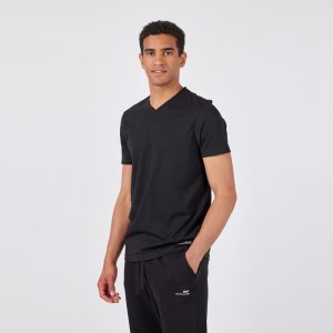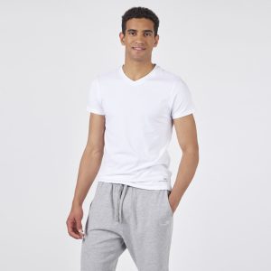 T-SHIRT, V-RINGAD STRETCHTYG – Vit